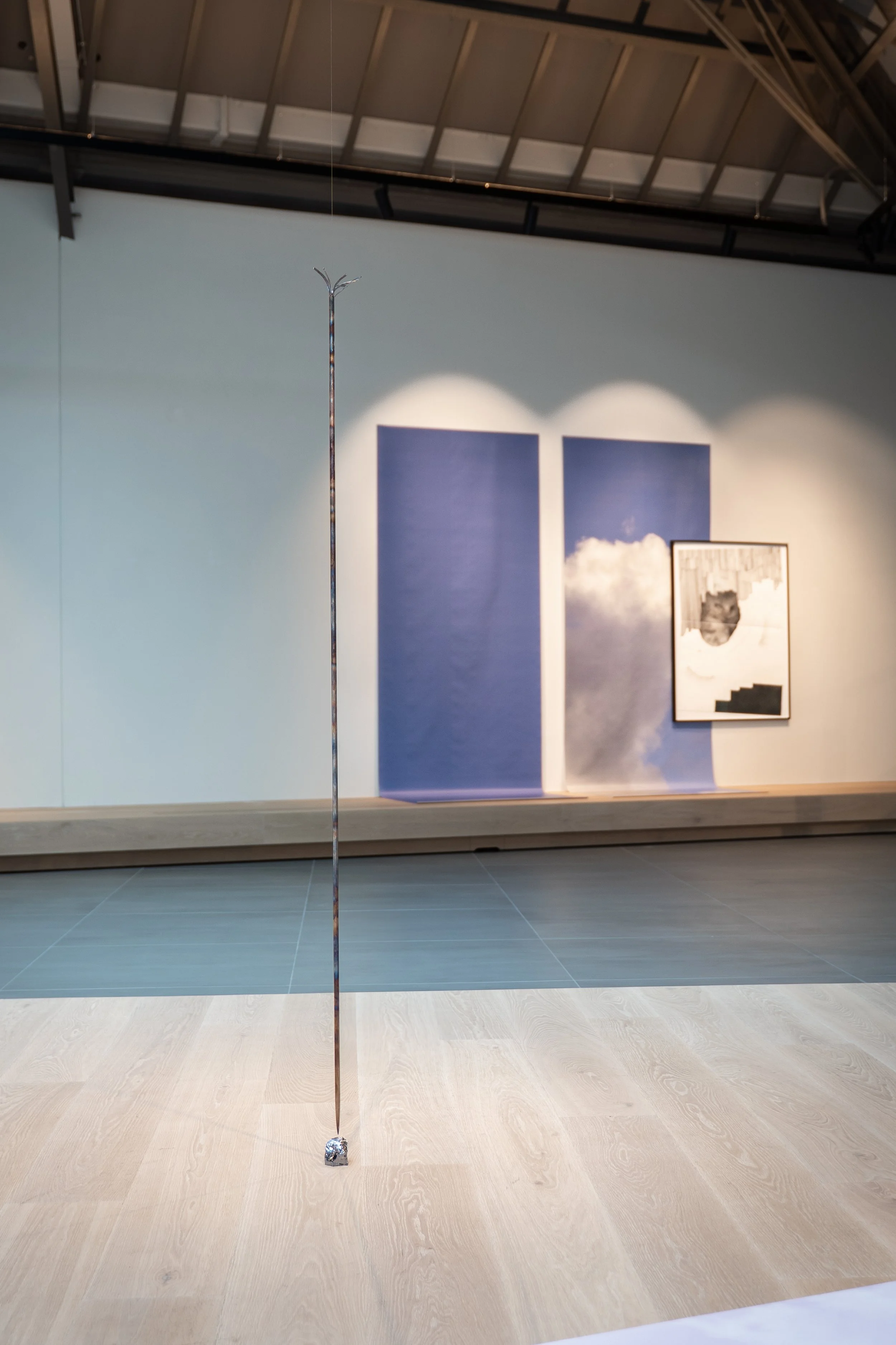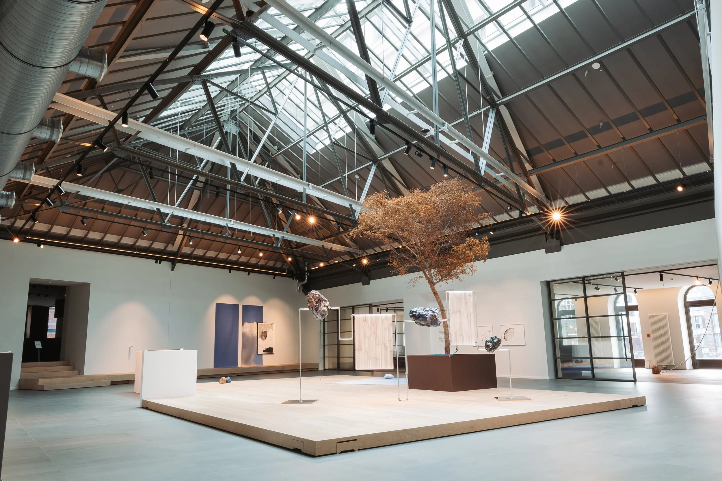 The connection to the body remains palpable. Some works invite physical interaction, they demand movement, closeness, spatial orientation. A photograph of the starry sky lies on the floor — the sky is no longer above us, but all around. A shift in perspective. Space becomes something we can enter, a space for reflection, a model — perhaps a sculpture park within the mind.