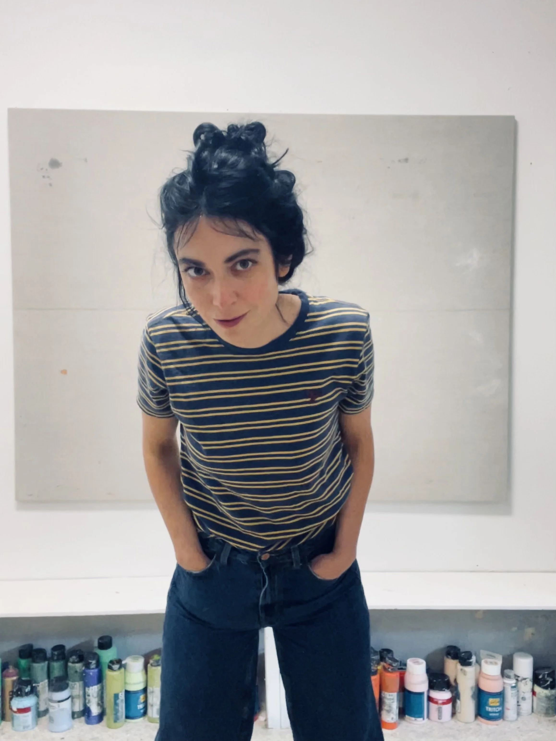 Working primarily in acrylic, she combines traditional techniques with unconventional formats. Some of her paintings draw on imagery from Super-8 films and found Polaroids discovered at flea markets, translating moments of collective memory into atmospherically charged compositions. Other works take shape on unstreched canvases that are layered, folded, left raw at the edges, or assembled in multiple sheets, creating a tactile surface reminiscent of archival manuscripts. This process expands the pictorial space into a sculptural dimension, blurring the boundary between image and object. At times, she extends this exploration through individually painted wooden boards that can be arranged modularly on the wall.
